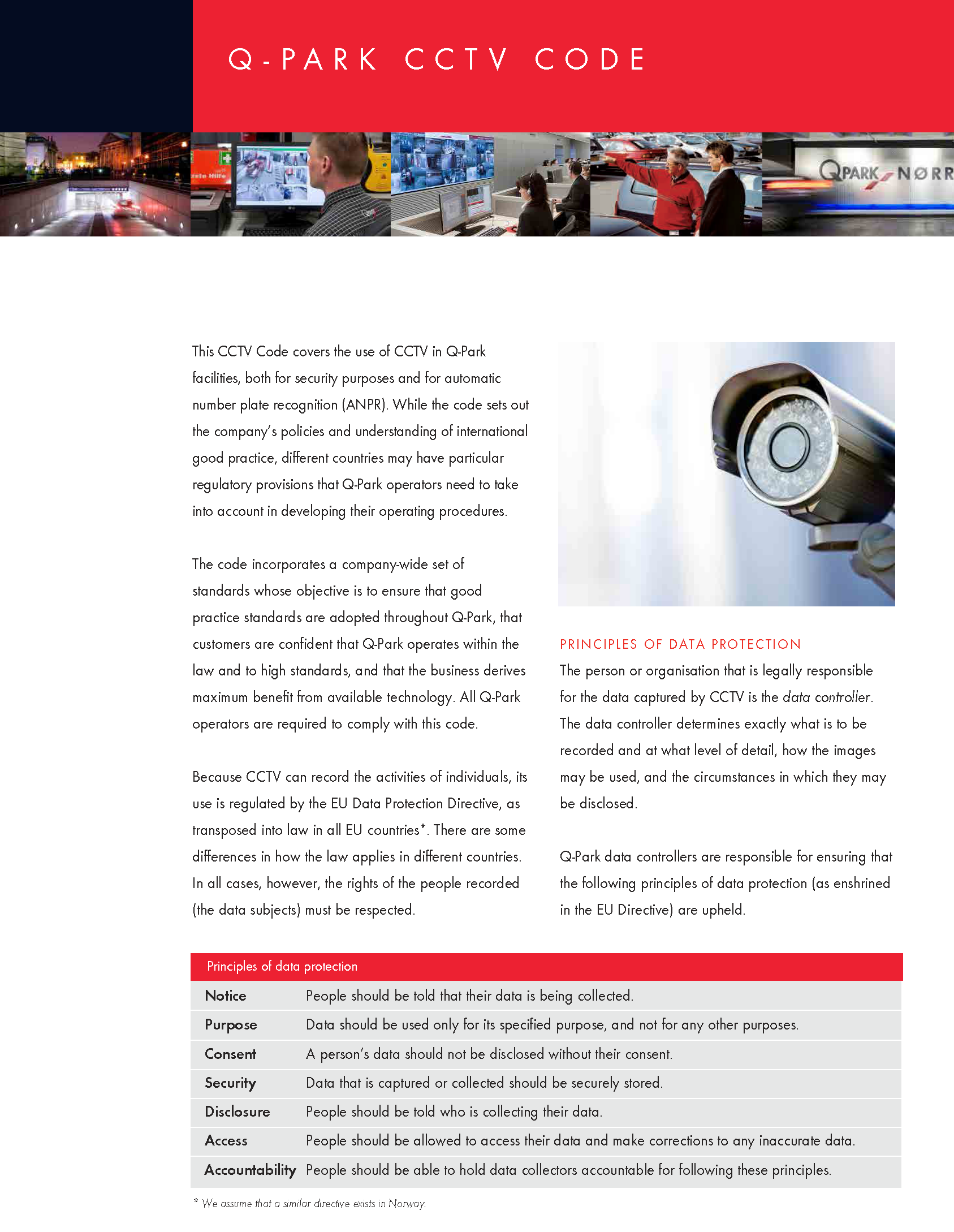 Het vastleggen van beelden en de opslag van gegevens raakt aan de privacy van onze klanten. Het is cruciaal dat Q-Park oplettend is als het gaat om de bescherming van deze gegevens. Omdat CCTV activiteiten van een individu kan opnemen, is het gebruik ervan wettelijk vastgelegd. Gegevens worden veilig opgeslagen op een plek waartoe slechts enkele mensen binnen de organisatie toegang hebben. Gegevens worden slechts bewaard voor zo lang als nodig en maximaal 30 dagen.